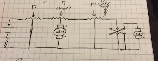 I wanted to use the 3 potentiometers to control the voltage/current of one power source going to these two motors. I drew a diagram of what I imagined.